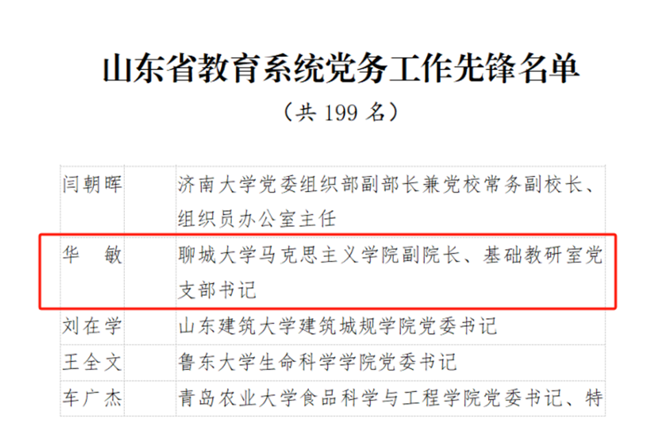根据《关于开展全省教育系统党务工作者深入学习宣传贯彻党的二十大精神“当先锋、作表率”主题实践活动的通知》(鲁教工委函〔2022〕95 号)和《关于开展全省教育系统党务工作先锋、共产党员先锋岗遴选工作的通知》(鲁教工委函〔2023〕33号)要求,经学校推荐申报、省委教育工委审核,遴选命名全省教育系统共产党员先锋岗200个、党务工作先锋199名。我院基础教研部党支部书记华敏光荣入选,获“全省教育系统党务工作先锋”称号。