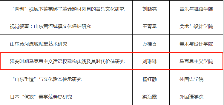 我院刘琳琳老师获批山东省社科联2023年度人文社会科学课题 发布时间: 2023-09-06 近日,山东省社科联发布2023年度人文社会科学课题立项通知,我院刘琳琳老师获批一项:延安时期马克思主义话语权建构实践及其时代价值研究。 (审核 黄昊)