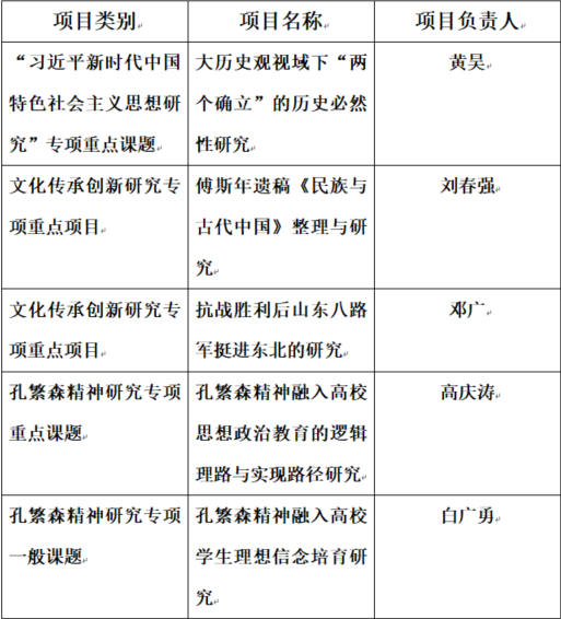 近日,聊城市哲学社会科学研究规划领导小组办公室公布《2023年度聊城市哲学社会科学规划课题立项公告》,我院5项课题予以立项,其中重点项目4项,一般项目1项。黄昊主持的《大历史观视域下“两个确立”的历史必然性研究》获批“习近平新时代中国特色社会主义思想研究”专项重点课题;刘春强主持的《傅斯年遗稿《民族与古代中国》整理与研究》、邓广主持的《抗战胜利后山东八路军挺进东北的研究》获批“文化传承创新研究”专项重点项目;高庆涛主持的《孔繁森精神融入高校思想政治教育的逻辑理路与实现路径研究》获批“孔繁森精神研究”专项重点课题;白广勇主持的《孔繁森精神融入高校学生理想信念培育研究》获批“孔繁森精神研究”专项一般课题。