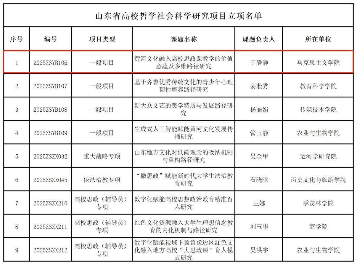 我院教师获山东省高等学校哲学社会科学研究项目立项 发布时间: 2025-10-18 近日,山东省教育厅发布山东省高等学校哲学社会科学研究项目立项名单,我校获批9项,立项率70%。其中,我院教师于静静喜获立项。 近年来,太阳集团城娱8722持续加强科研工作的组织与引导,着力提升课题申报质量,通过多轮研讨、专家指导和文本打磨,不断优化申报材料,科研立项水平稳步提升。未来,学院将以高层次科研项目为抓手,秉持服务社会发展的理念,紧密围绕国家重大战略和区域发展需求,进一步推动理论研究与实践应用深度融合,为新时代思想理论建设和社会进步贡献智慧与力量。 (审核 黄昊)