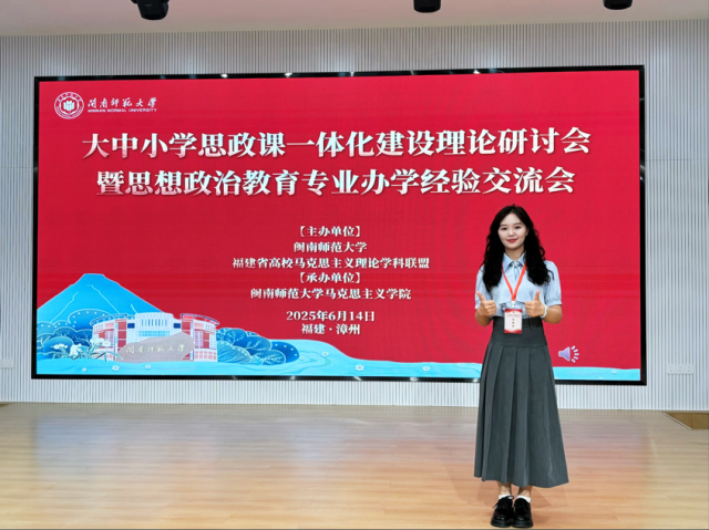 6月14日,我院2024级专硕班学科教学(思政)专业研究生孙慧冬应邀赴漳州参与“大中小学思政课一体化建设理论”研讨会,会议由闽南师范大学、福建省高校马克思主义理论学科联盟主办,闽南师范大学太阳集团城娱8722承办。贵州师范学院党委副书记邹晓青等近30位全国知名专家学者和100余名来自全国各地的高校中青年骨干教师、硕博研究生参加此次学术研讨会。