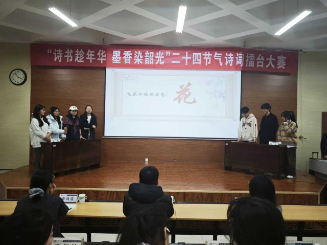 紧接着,飞花令环节正式打响。十二支晋级队伍围绕指定关键字轮番吟诵诗句,我院选手各展所长,于平仄韵律间传递传统文化之美,为在场师生呈现了一场精彩纷呈的诗词文化盛宴。最终,六支队伍进入“线索猜节气”终极环节。我院选手冷静分析、周密推理,不仅准确猜出节气名称,更结合其历史渊源与文化意涵进行阐述,体现出宽广的知识视野与优秀的语言组织能力,赢得评委与观众的一致认可。