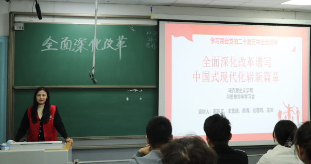 10月24日,我院青年学习会成员赵乐文、王誉洁、高倩到西校区博喻楼A125开展了题为《全面深化改革谱写中国式现代化崭新篇章》的宣讲。