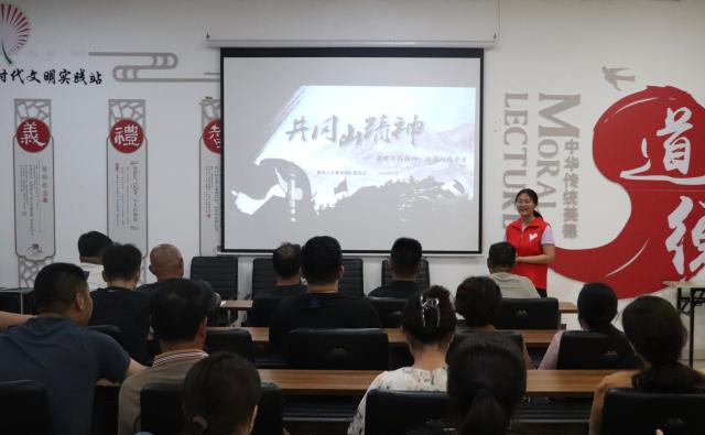 昔上井冈山,革命得摇篮。宣讲团成员通过诗词《西江月·井冈山》拉开宣讲序幕,用一个个动人的红色故事诠释井冈山精神,并围绕井冈山革命根据地的建立、井冈山精神的科学内涵、井冈山精神形成的时代价值三个方面,生动再现了井冈山艰苦斗争的革命历史,引领居民们深刻感悟以毛泽东为代表的一批共产党人坚定执着追理想、实事求是闯新路的伟大革命精神。宣讲团成员讲到,井冈山精神自形成以来,就是我们党宝贵的精神财富,也是砥砺我们不忘初心、牢记使命的不竭精神动力,需要我们永远铭记,世代传承。步入新时代,我们依旧要保持一往无前和驰而不息的奋斗姿态,在做好每一件小事、完成每一项任务、履行每一项职责中,做井冈山精神的积极践行者,努力让井冈山精神放射出新的时代光芒!