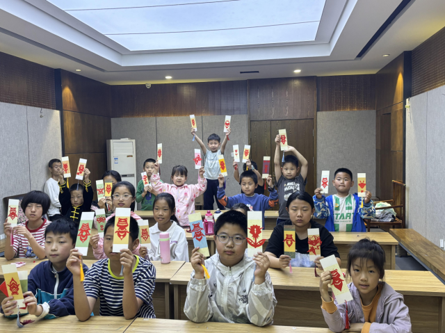 讲解员以生动的语言带领孩子们追溯剪纸艺术的千年传承,她从商周时期“剪桐封弟”的历史典故引入主题,系统梳理汉唐窗花的演变脉络,剖析明清刺绣纹样的工艺密码,展示当代创新设计中传统元素与现代美学的融合成果,让孩子们在理论学习中感受非遗文化的深厚底蕴。 非遗剪纸技艺传习课堂上,志愿者以“非遗守护者”的身份开展沉浸式教学,指导孩子们从折纸、运剪、塑性等基本技法入手,学习基础纹样剪法。掌握要领后,孩子们将传统图案拆分重组,自由创作出融合传统色彩与几何美学的作品。四季花卉、吉祥纹等图案跃然纸上,童趣创意与传统技艺相映成趣,展现出少年一代对非遗文化的理解与热爱。