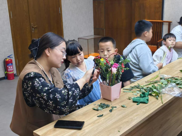 活动现场,各组亲子家庭在社教老师的指导下,系统学习中国传统插花技法的基础理论与实操要领。志愿者通过分步骤演示花材处理、色彩搭配及造型设计等关键环节,向亲子家庭传授“花茎斜剪延长花期”“主枝黄金比例定位”等兼具实用性与艺术性的插花技巧。亲子搭档们默契配合,将康乃馨、满天星、尤加利叶等精选花材进行创造性组合,最终完成十余件层次错落有致、意境清新雅致的花艺作品。 社教老师以康乃馨承载的“母爱无疆”文化意象为切入点,引导孩子们敞开心扉,分享家庭生活中的温情记忆。孩子们依次讲述了“为加班父亲送伞”“祖孙三代共植家庭树”等真实生活片段,童真质朴的语言中流淌着真挚情感,多位家长在聆听过程中情不自禁擦拭眼角泪光,此起彼伏的掌声回荡在活动现场。