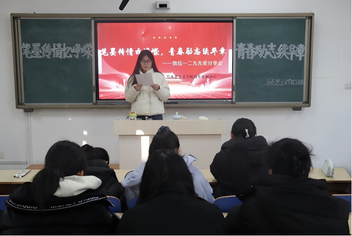 2024级1班李梦娇则通过历史影像引出主题,以深情朗诵书信的方式,将书本中的爱国精神转化为真切可感的情感表达,传递出对先辈的崇高敬意。 墨香传薪火,青春续华章。此次活动,不仅让同学们于笔墨书香间体悟书信文化的深厚底蕴,更引领大家深刻感知爱国精神的传承与内涵。大家一致表示,将自觉赓续红色血脉,把从先辈故事中汲取的精神力量,转化为砥砺前行、强国有我的实际行动,在新时代的征程上续写无愧于祖国、无愧于时代的青春华章。