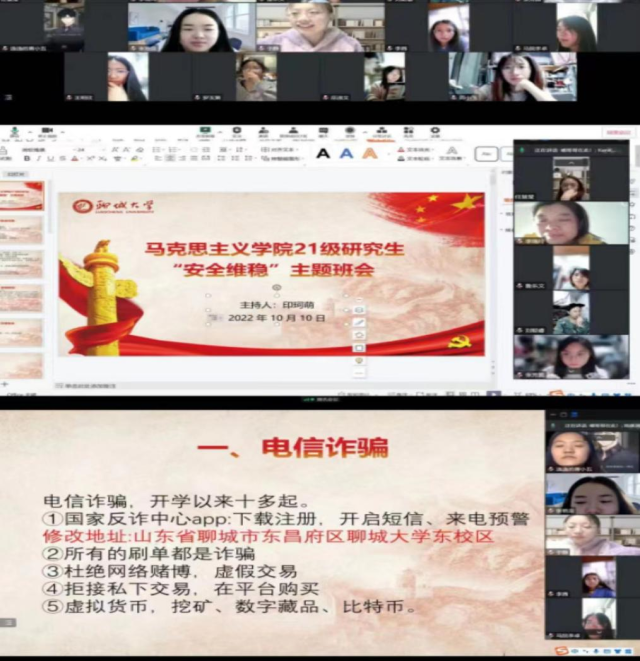 2021级研究生开展“安全维稳”反诈主题班会,围绕安全问题,主持人着重为大家讲解开学以来发生的十多起电信诈骗案例,包括“线上预约免费美容”“微博抽奖”“网贷、裸贷”等大学生日常生活中常见电信诈骗类型,主持人以幽默诙谐的语气为大家讲解防诈骗知识,细心制作防诈骗小贴士,重点讲解国家反诈骗修改地址,开启短信,来电预警预防诈骗解决方法。最后,主持人为大家播放国家反诈中心反诈宣传片,进一步提高学生们的反诈能力,筑牢反诈“防护墙”。