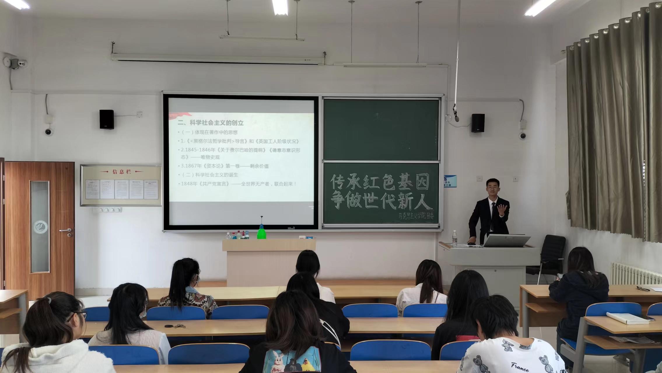 回首向来风雨路,初心如磐谱华章。王子强以“赓续红色血脉,谱写时代新篇”为主题,讲述了社会主义发展时期的红色故事,吸引同学们对社会主义发展的兴趣。王子强从社会主义发展的阶段出发,把社会主义发展史分为沉睡到觉醒,空想到科学,理论到实践,坚守与发展四部分,全面地剖析了社会主义各个阶段的产生、发展、成熟及其影响,深入浅出,脉络清晰。通过马克思主义中国化的例子、中国特色社会主义成就,王子强为在座同学客观阐释了中国特色社会主义发展的光明前景,呼吁当代大学生勇于承担时代大任,传承红色基因,争做时代新人。作为思想教育专业的学生,同学们更应该不忘初心,砥砺前行,在一次次重温历史的过程中有新的思想升华和认识,胸怀大志,铭记来时路,奋进新征程!
