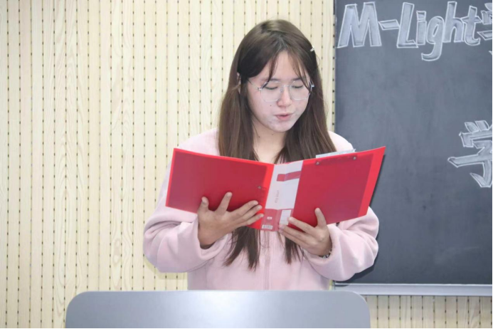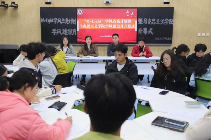 开幕式上,学院学习发展部高轩首先向大家系统阐释了“M-Light”学风点亮计划五维赋能体系的具体内涵,即“M-Light”意为以马克思主义的真理之光、知识的智慧之光照亮成长之路,是由“Marxism、Logic、Industrious、Grace、Hands on、Theory”六个英文单词首字母组成。学风点亮计划涵盖“思辨之光”理论笔耕工程、“奋进之光”励志笃行工程、“境界之光”审美提升工程、“实践之光”躬行服务工程、“原理之光”经典深读工程等五项内容,旨在通过多维度、成长性的活动设计,全面激发学生成长内驱力。