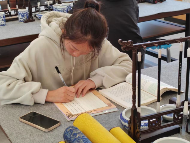 墨香氤氲显静气,笔锋流转见真章。比赛现场,选手们以笔墨为媒,以纸砚为介,将经典诗词、名言警句与青春感悟落于笔端,作品内容兼具文化厚度与时代温度,既涵盖《劝学》等千古传诵的国学经典选段,亦收录红色经典篇目等浸润家国情怀的隽永篇章。他们或端坐凝神、笔锋沉稳,或提笔沉思、气韵内敛,手中的钢笔勾勒出刚劲有力的笔画与飘逸灵动的线条。楷书端正匀称、结构严谨,尽显汉字方正之美;行书潇洒流畅、气韵生动,彰显笔意流转之姿;隶书古朴典雅、端庄厚重,蕴含古韵雅致之味。
