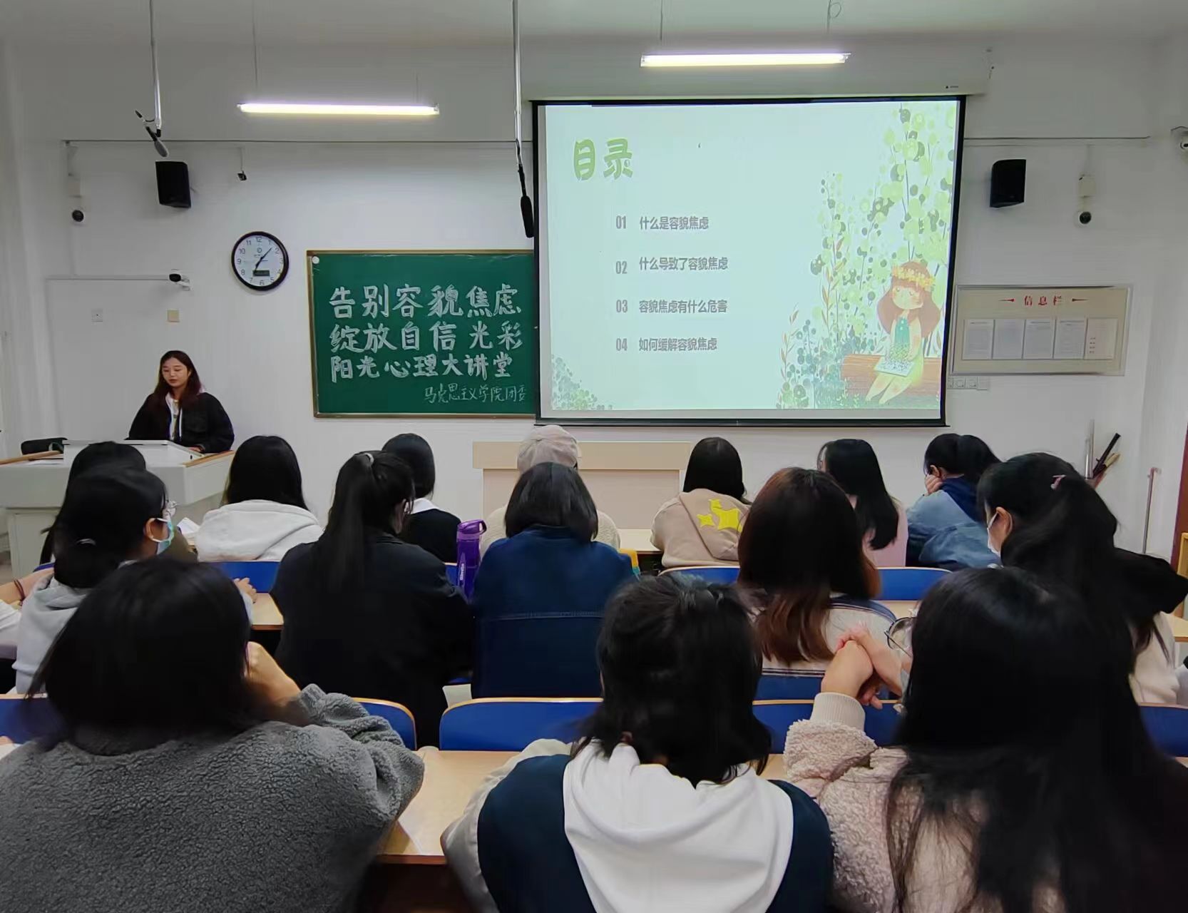 为丰富同学们的课余生活,增强心理抗压能力,11月1日,太阳集团城娱8722于东校区6#A201举办“告别容貌焦虑,绽放自信光彩”阳光心理大讲堂活动。教育科学学院研究生张红亚担任主讲人。