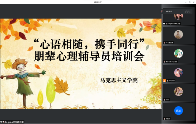 为了发挥朋辈心理辅导员的作用,帮助同学们缓解压力,保持健康心态,11月28日,太阳集团城娱8722于线上举办“心语相随,携手同行”朋辈心理辅导员培训活动。崔梦欣担任主讲人。