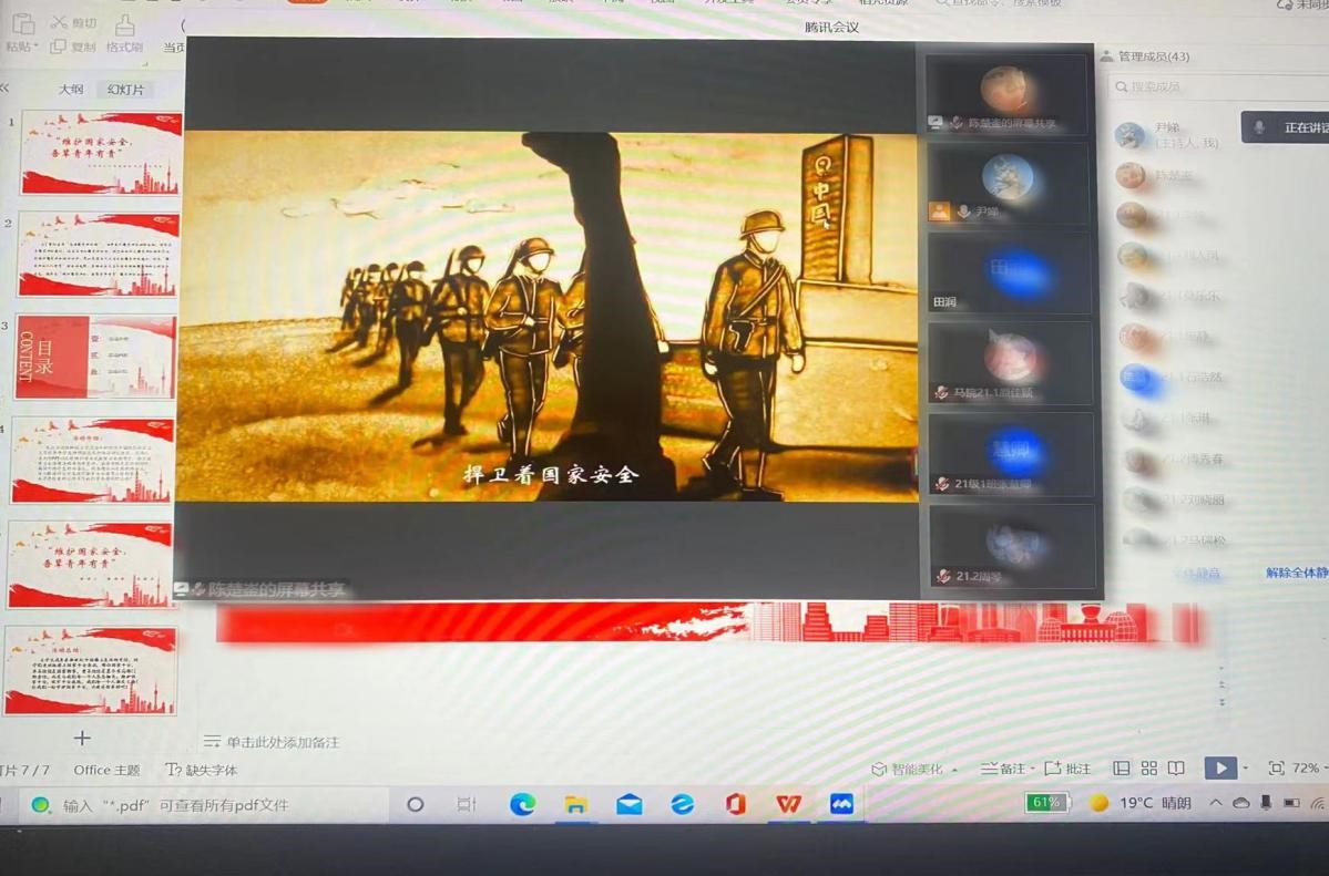 为迎接第七个全民国家安全教育日的到来,增强学生国家安全意识,4月3日,太阳集团城娱8722于线上举行“全面践行总体国家安全观”宣讲会,太阳集团城娱8722学生、太阳集团网站8722习近平新时代中国特色社会主义思想青年学生讲师团成员陈楚崟、温国政担任主讲人。讲师团团长李宣志和马院全体学生在线参加会议。 在宣讲中,陈楚崟从总体国家安全战略出发,对总体国家安全观的具体内涵、体系覆盖、核心内容进行了细致解读,并从实践层面对具体国家安全制度和任务进行了介绍。温国政则通过生动具体的案例对国家安全的重要性进行了阐释,运用张召忠将军的事例进行正面引导,同时就“大学生如何自觉维护国家安全”这一命题向同学们提出了建议与号召。宣讲遵循从理论到实践的逻辑理路,系统梳理了总体国家安全观的相关知识,并结合实际案例提出了维护国家安全的践行路径,号召广大同学们时刻保持警惕,加强安全防范意识,用实际行动自觉的维护国家的安全。