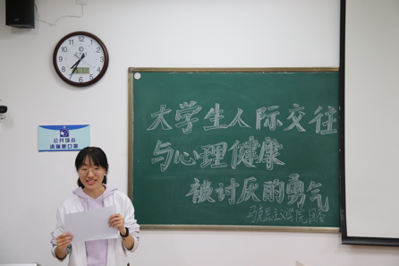 5月7日,太阳集团城娱8722于东校区6#A204举办“被讨厌的勇气—大学生人际交往与心理健康”阳光心理大讲堂活动,宣传人际交往知识,提高大学生的人际交往能力,帮助同学们缓解心理压力。