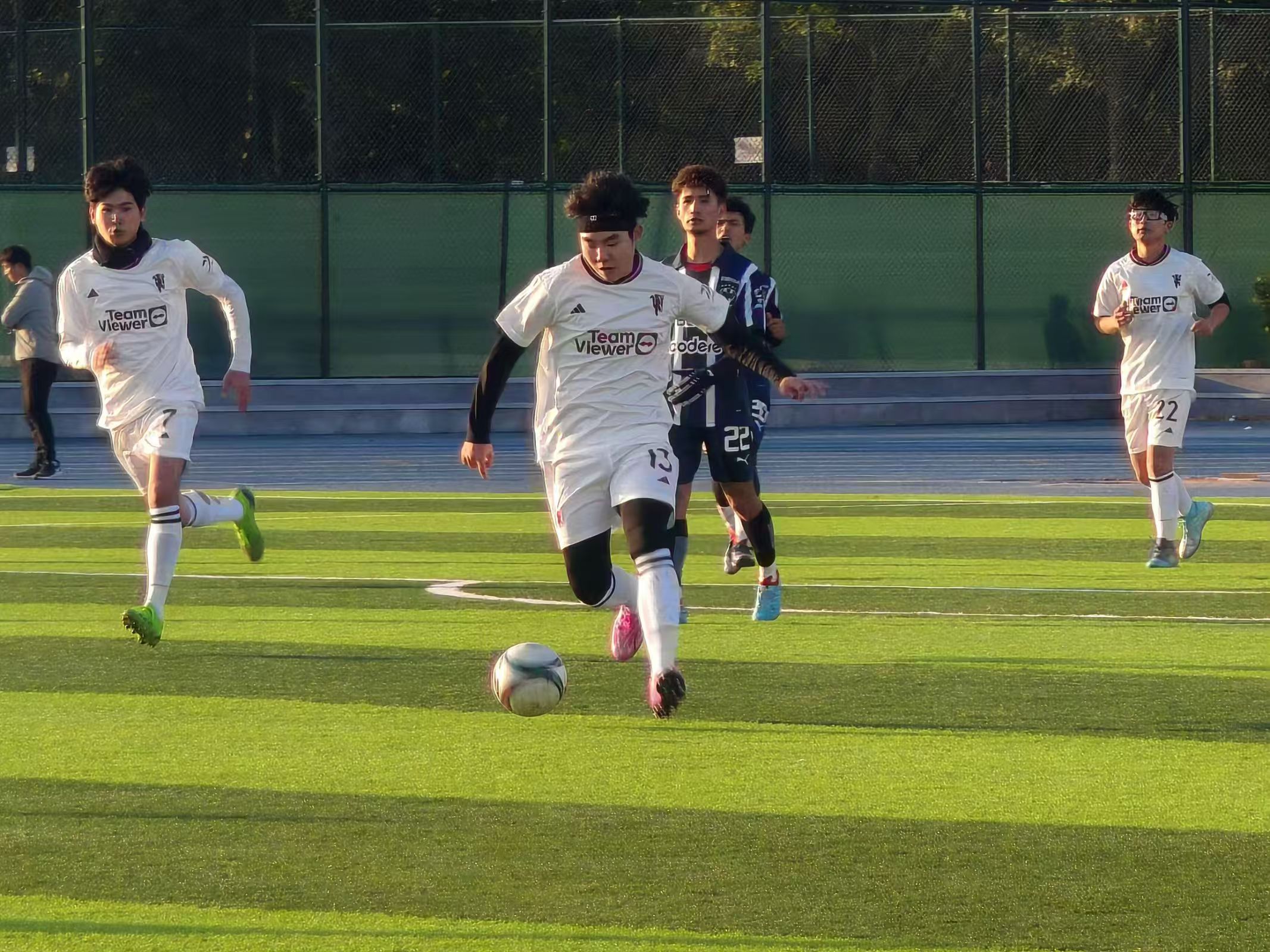 哨声吹响,上半场比赛结束。我方球员迅速调整状态,准备下一场的角逐。足球在球员们的脚下不断传递、争抢,球的轨迹串联起了每一个精彩的瞬间。观众们的心也随着球的起伏而高悬,时而欢呼、时而叹息。随着哨声的吹响,比赛落下帷幕。在这片充满活力的足球场上,各院足球队球员用他们的拼搏和追逐,共同书写着属于青春的壮丽篇章。