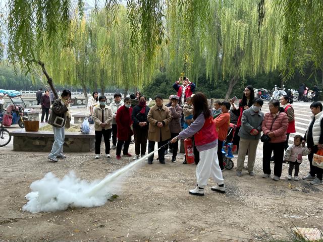 活动现场,团支部成员依托消防知识宣传册,紧紧围绕火灾的成因、危害以及常见的火灾类型等多个方面,带领社区居民全方位、多角度了解相关消防知识。随后,团支部成员详细介绍了灭火器的种类及其适用范围,并现场演示了灭火器的正确使用步骤。居民们在团支部成员的指导下亲身体验“提、拔、握、压”四步操作法,极大地激发了居民学习消防安全知识的兴趣,增强了居民们面对火灾时的信心。
