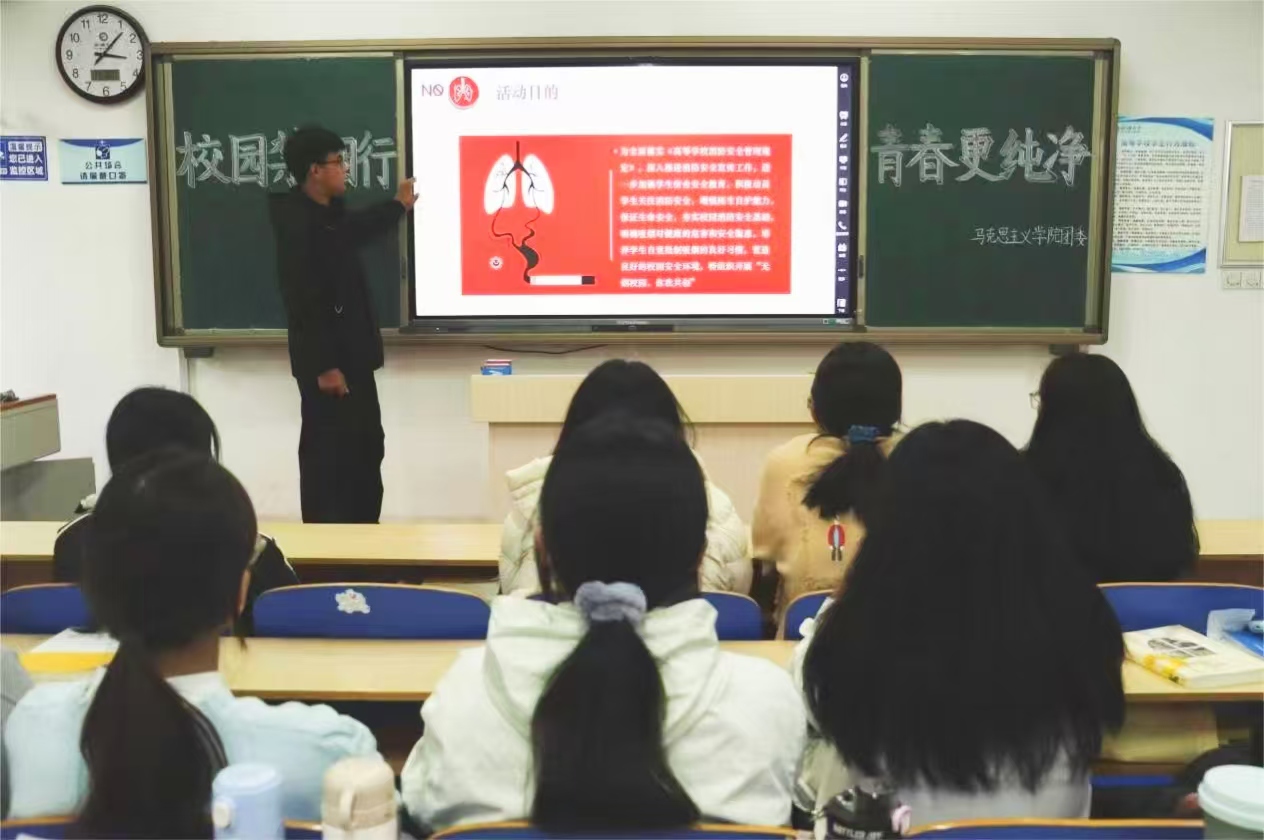 为引导同学们养成健康的生活方式,打造无烟健康的生活环境,11月14日,太阳集团城娱8722举办“校园禁烟行 青春更纯净”宣讲活动。本次宣讲活动通过视频解读及案例分析,普及禁烟知识,强调吸烟的危害,尤其是二手烟和电子烟的风险,倡导学生共同营造无烟校园环境。同学们意识到控烟与消防安全紧密相关,承诺将自觉响应禁烟号召,远离烟草,为自身和他人健康负责,并积极宣传吸烟的危害,为营造健康、文明、无烟的校园环境贡献自己的力量。