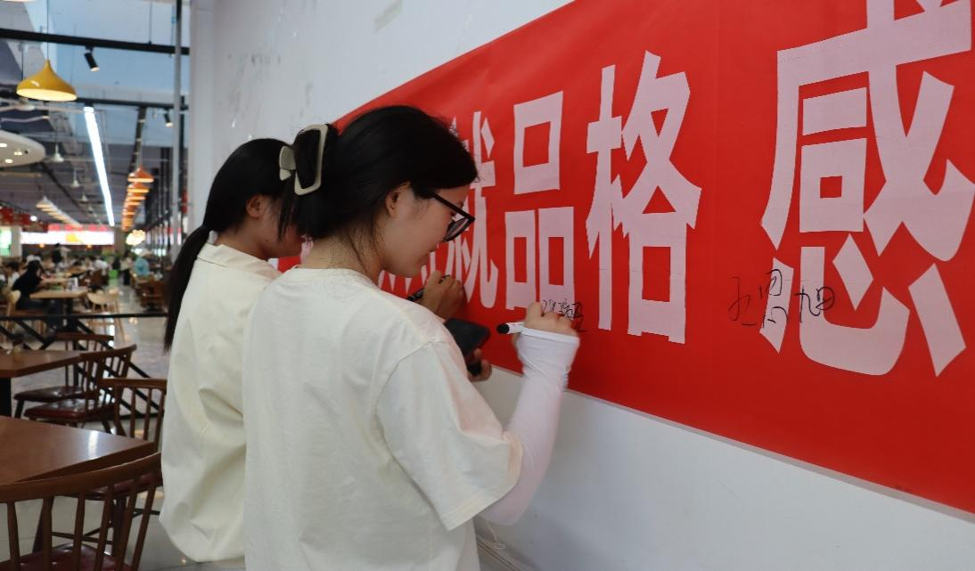 活动负责人首先向同学们讲解了国家资助政策的内容和意义以及国家助学贷款毕业确认工作的相关事宜,呼吁大家心怀感恩、诚信做人,并以实际行动践行感恩之心。同学们在深入了解了国家资助政策的相关内容以及诚信在资助过程中的关键作用后,依次有序地在题为“诚信还款铸就品格,感恩之心回报社会”的横幅上签下自己的姓名,构成了一面承载着厚重情谊的感恩横幅。他们用有力的笔触表达对每一个人的感激之情,表明了坚守诚信的决心。他们签下的,不是普通的姓名,更像是一份责任,一份对自己承诺。