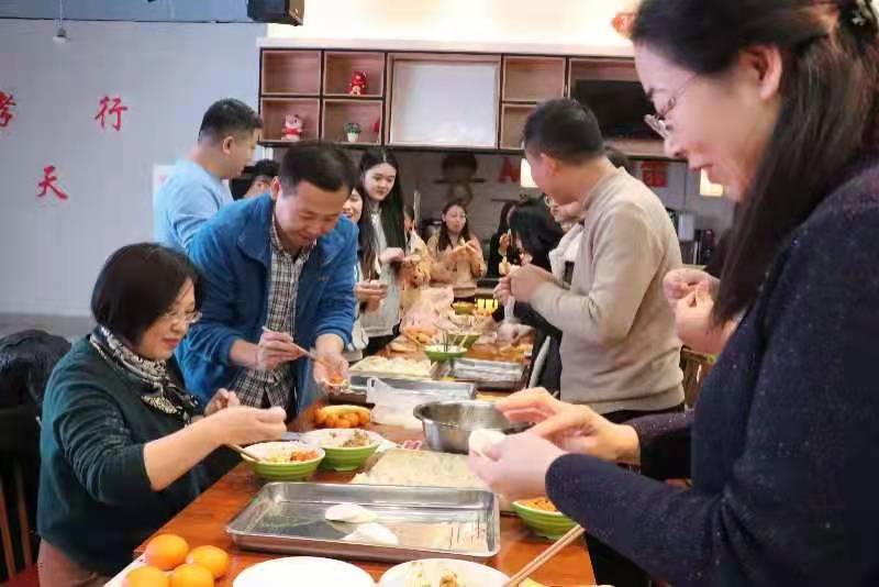 天时人事日相催,冬至阳生春又来。今天,老师与学生们齐聚一堂,开展冬至包饺子活动。大家在简单准备工具、食材后,便开始分工协作,有的揉面、有的擀面皮、有的包馅,互相交流各种不同的包法,现场一片欢声笑语,气氛热情且温馨。在大家的共同努力下,一盘盘热气腾腾的饺子摆上了餐桌,散发着“家”的味道和温暖。刘子平向大家表达了节日祝福,对大家的劳动成果表示肯定与赞扬,他表示冬至是白昼黑夜时间的节点,今后便是白昼长于黑夜,借此表达对四、六级考生以及考研学子的深深祝福,热烈的掌声中,刘子平宣布餐厅沙龙活动正式开始。大家吃着饺子,相互交谈,欣赏歌舞表演。神昆山、胡安航用清澈的嗓音歌唱了《牧马城市》,阿米妮古丽·吐逊江用曼妙的舞姿演绎了《楼兰姑娘》,老师与学生组织部分成员合唱《夜空中最亮的星》一同表达对未来的美好祝愿。
