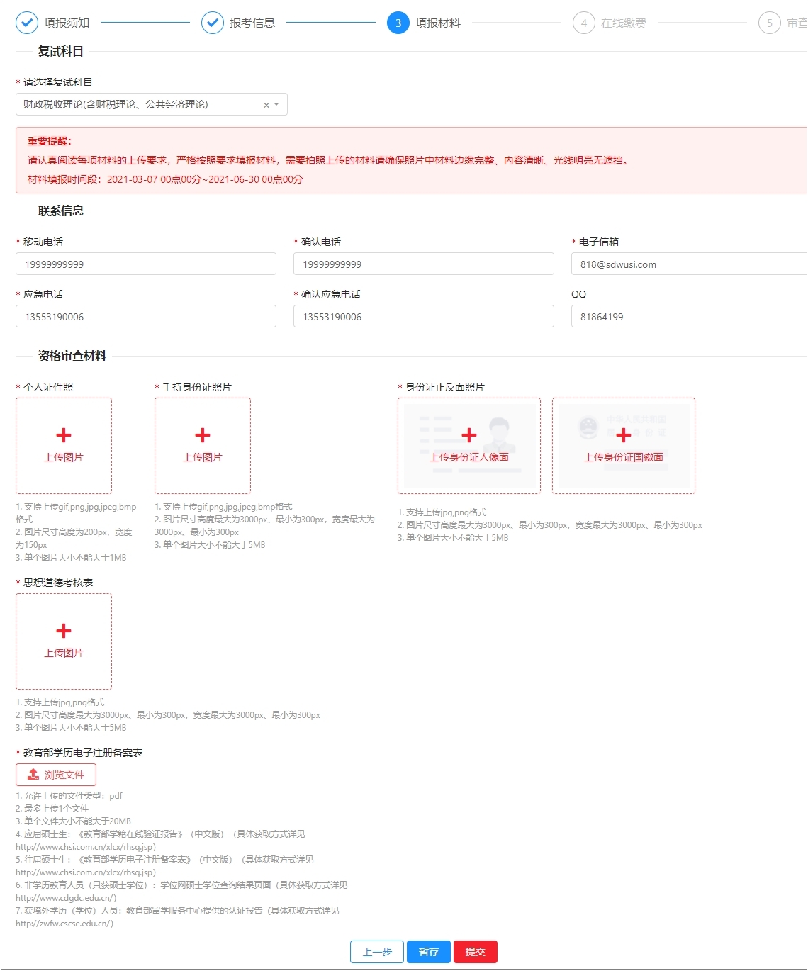 第三步:填报材料。首先选择复试科目,然后填写联系信息,上传审查材料的图片。上传后可以点击【暂存】,如果确认无误也可以直接点击【提交】,提交后无法修改审查材料。(需要填写的材料以实际页面为准