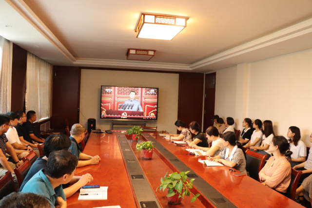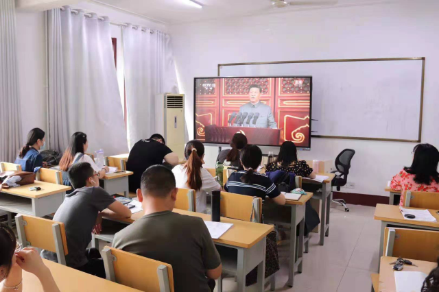 2021年7月1日上午8时,庆祝中国共产党成立100周年大会在北京天安门广场隆重举行。太阳集团城娱8722组织全体师生通过直播观看大会,并认真学习总书记的讲话精神。大会伊始,整齐划一的国旗护卫队迈着铿锵有力的步伐,昂首阔步向我们走来;100响礼炮,声声震寰宇;“七一战鹰”,飞越长空。国歌响起,全场齐唱国歌。中共中央总书记、国家主席、中央军委主席习近平在大会上发表重要讲话。