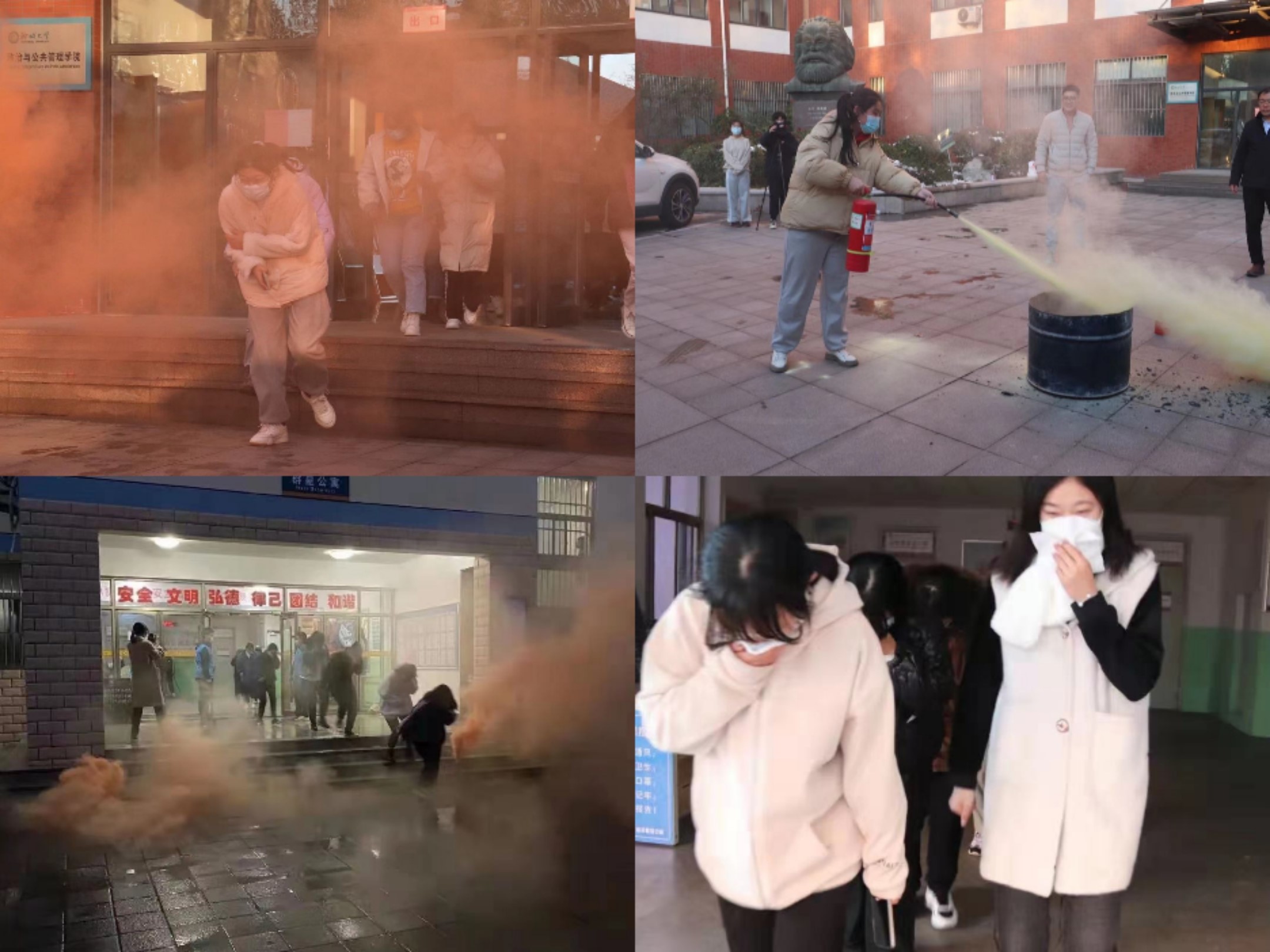 “平安校园在我心,安全行动手中行。”此次消防安全疏散演练分为学院和宿舍两个地方进行。警报声响起,学院消防演练正式开始。同学们迅速反应,自觉排成两队有序撤离教室。撤离过程中,用湿毛巾捂住口鼻,按照消防标示和逃生演练方案设定的路线,弯腰迅速撤离到马克思主义广场集合。在所有同学到达安全场地后,郑保忠对此次消防逃生演练所出现的问题进行指点。郑保忠拿起干粉灭火器,现场演示灭火器的使用方法,他按照提、拔、握、压四个动作,将火扑灭在萌芽状态。演示结束后,他邀请同学们依次按照规范动作手持灭火器对燃火桶进行灭火。同时他强调:灭完火之后要用水再彻底灭火一次,防止死灰复燃。宿舍演练中,在听到火灾警报声后,同学们迅速向安全地点逃离,撤离中不抢道、不惊慌,秩序井然。此次消防安全疏散演练通过点燃烟雾弹来最大程度模拟火灾现场,黑灰色的浓烟迅速弥漫开,让同学们切身感受到消防安全的重要性和必要性,并且牢记消防安全知识和掌握安全逃生技能。