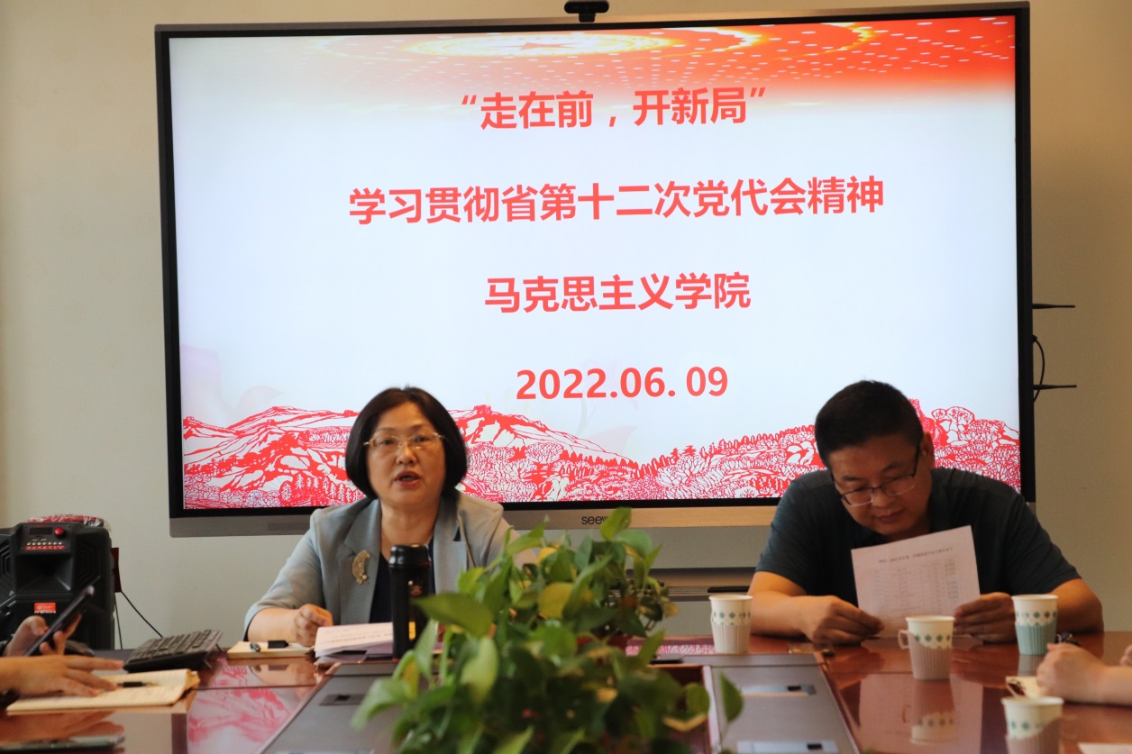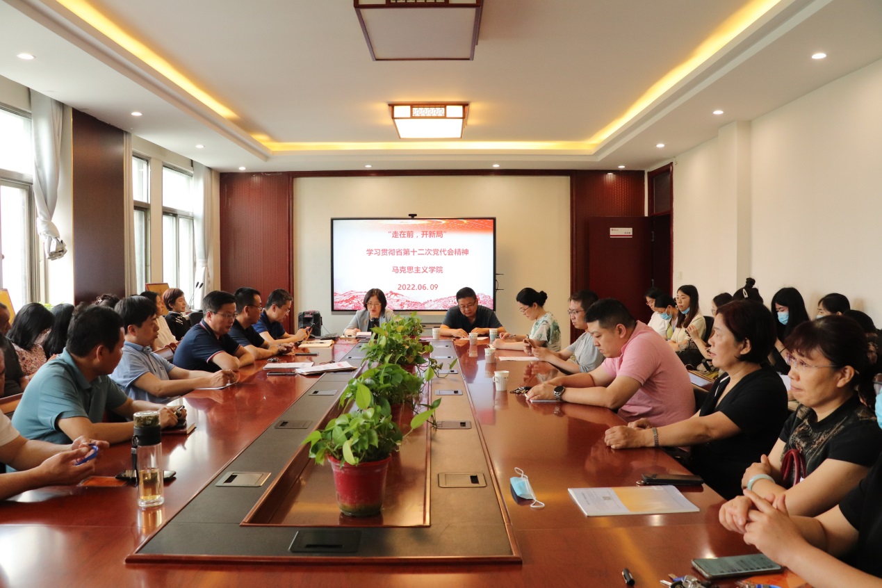 张华筠强调,要结合实际工作,坚决贯彻“走在前、开新局”的总要求,把党代会精神融入思政课教育教学之中,切实提高思政课教育教学质量;坚定不移落实立德树人根本任务,提升科学研究水平;以高质量党建为引领,把党建优势转化为发展优势,积极服务经济社会高质量发展。砥砺奋进新时代,昂首阔步新征程。全体教师表示,要更加紧密团结在以习近平同志为核心的党中央周围,接续奋斗,锐意进取,坚守“为党育人、为国育才”的初心使命,在新时代新征程上展现新气象新作为,为地方经济社会发展贡献马院力量,以优异成绩迎接党的二十大胜利召开。随后,学院各党支部分别就开展学习贯彻省第十二次党代会精神开展了主题党日活动。