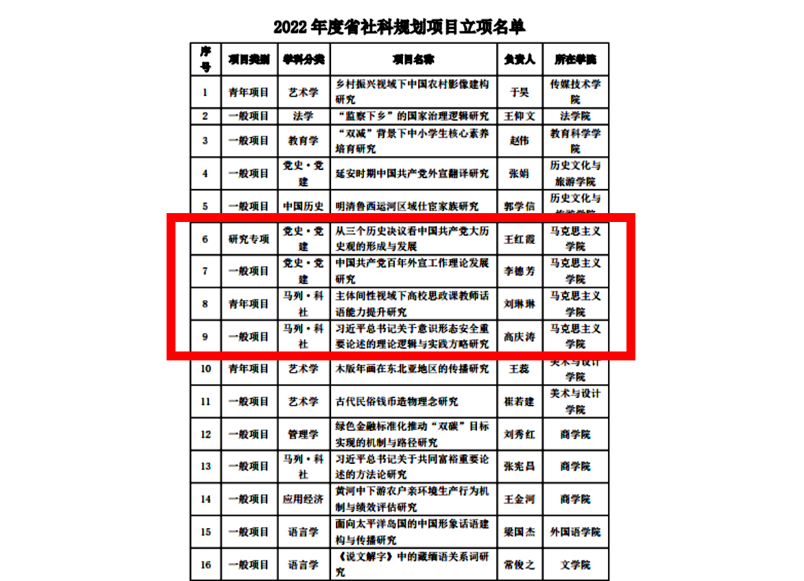 我院4位教师获2022年度山东省社科规划项目立项 发布时间: 2022-08-28 日前,山东省哲学社会科学工作办公室公布了《2022年度山东省社科规划项目立项名单》,我校20个项目获得立项。其中,我院教师王红霞主持的《从三个历史决议看中国共产党大历史观的形成与发展》、李德芳主持的《中国共产党百年外宣工作理论发展研究》、刘琳琳主持的《主体间性视域下高校思政课教师话语能力提升研究》及高庆涛主持的《习近平总书记关于意识形态安全重要论述的理论逻辑与实践方略研究》等4项获批立项,获批立项数量位居全校首位。 (审核 黄昊)