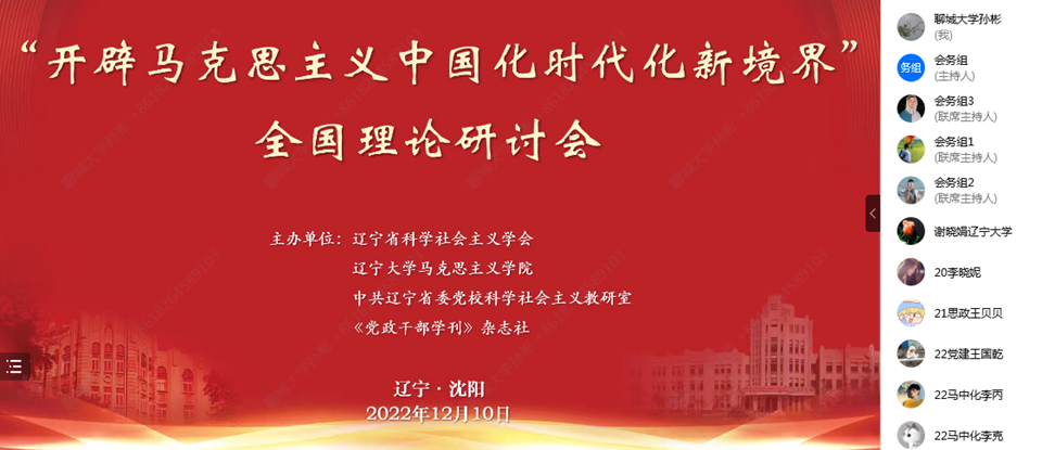 为深入学习贯彻党的二十大精神,2022年12月10日,辽宁省科学社会主义学会、辽宁大学太阳集团城娱8722、中共辽宁省委党校科学社会主义教研室、《党政干部学刊》杂志社等单位主办“开辟马克思主义中国化时代化新境界”理论研讨会,来自中国人民大学、北京邮电大学、南开大学、吉林大学、四川大学、南京师范大学等专家学者,相聚云端,围绕“中国共产党为什么能,中国特色社会主义为什么好,归根到底是马克思主义行,是中国化时代化的马克思主义行”,从中国式现代化、执政党建设等多重维度交流研讨。研讨会共收到论文500余篇,我院教师孙彬以文参会,受邀参会。