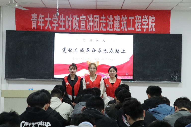 3月24日,我院青年大学生时政宣讲团成员于静、李茜、王明欣在5号教学楼401室作了题为《刀刃向内——党的自我革命永远在路上》的宣讲。建筑工程学院2022级学生代表参加此次宣讲会。