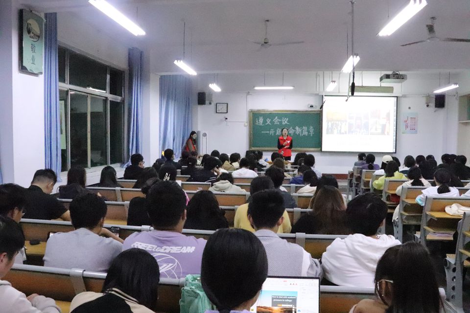 10月27日,我院青年大学生时政宣讲团成员孟煜、郭昊铭在1号楼301室作了题为《遵义会议——开启革命的新篇章》的宣讲。商学院2022级、2023级学生代表参加此次宣讲会。