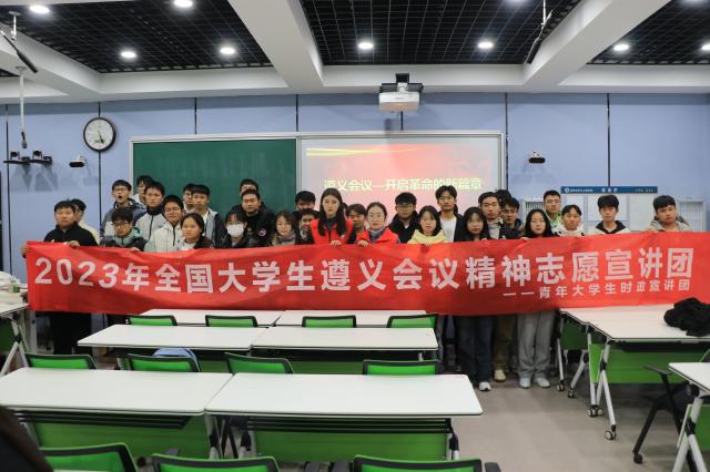 宣讲团成员立足于“讲好遵义故事,赓续红色血脉”的历史初心,通过丰富翔实的事例从遵义会议的背景、遵义会议的召开、遵义会议的意义三个方面带领同学们深入了解遵义会议的精神内核,感受蕴藏在过往岁月中的历史厚重感与使命认同感,从而使遵义会议的历史智慧与精神实质得以发展升华。宣讲团成员指出红色遵义经典磅礴,传承着“实事求是、独立自主、民族团结、坚定信念、敢闯新路”的精神财富,中国人民要从一个胜利不断走向新的胜利,继续发扬遵义会议精神,在中国共产党的领导下,不忘初心,砥砺前行,汇聚全民之力推进实现中华民族伟大复兴!