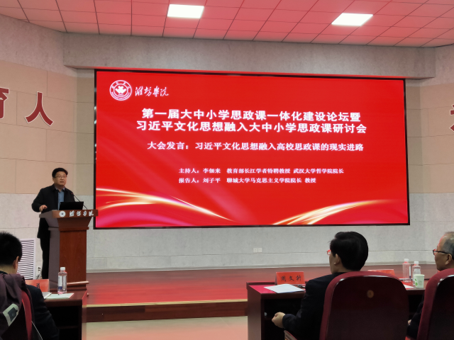 论坛共分为主旨报告、主题报告、大会发言三个阶段。我院院长刘子平教授作了题为“习近平文化思想融入高校思政课的现实进路”的报告。他在报告中指出,办好思政课,就是要开展马克思主义理论教育,用习近平新时代中国特色社会主义思想铸魂育人,用习近平文化思想武装头脑,引导学生增强“四个自信”,厚植爱国主义情怀,并从“学好悟透习近平文化思想,实现全面融入”“创新思政课堂教学形式,实现生动融入”“丰富实践教学形式,实现多样融入”三个方面详细分析了实现习近平文化思想真正进教材、进课堂、进学生头脑的具体路径。