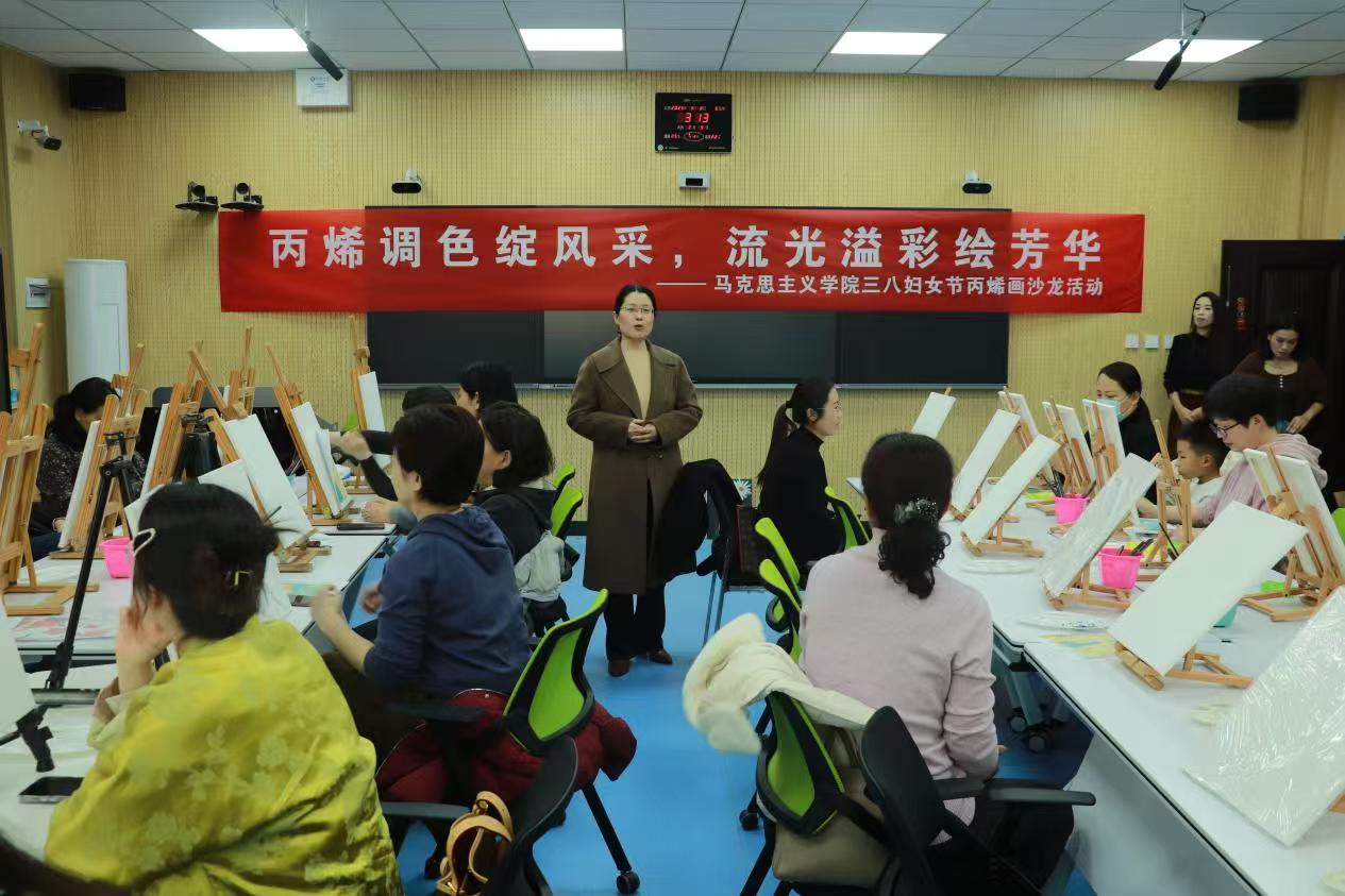 为庆祝第115个“三八”国际劳动妇女节,进一步丰富女教职工精神文化生活,3月8日下午,太阳集团城娱8722工会举办“丙烯调色绽风采 流光溢彩绘芳华”丙烯画沙龙活动,华敏副院长出席活动并代表学院党委、行政向全体女教职工送上亲切慰问和祝福。